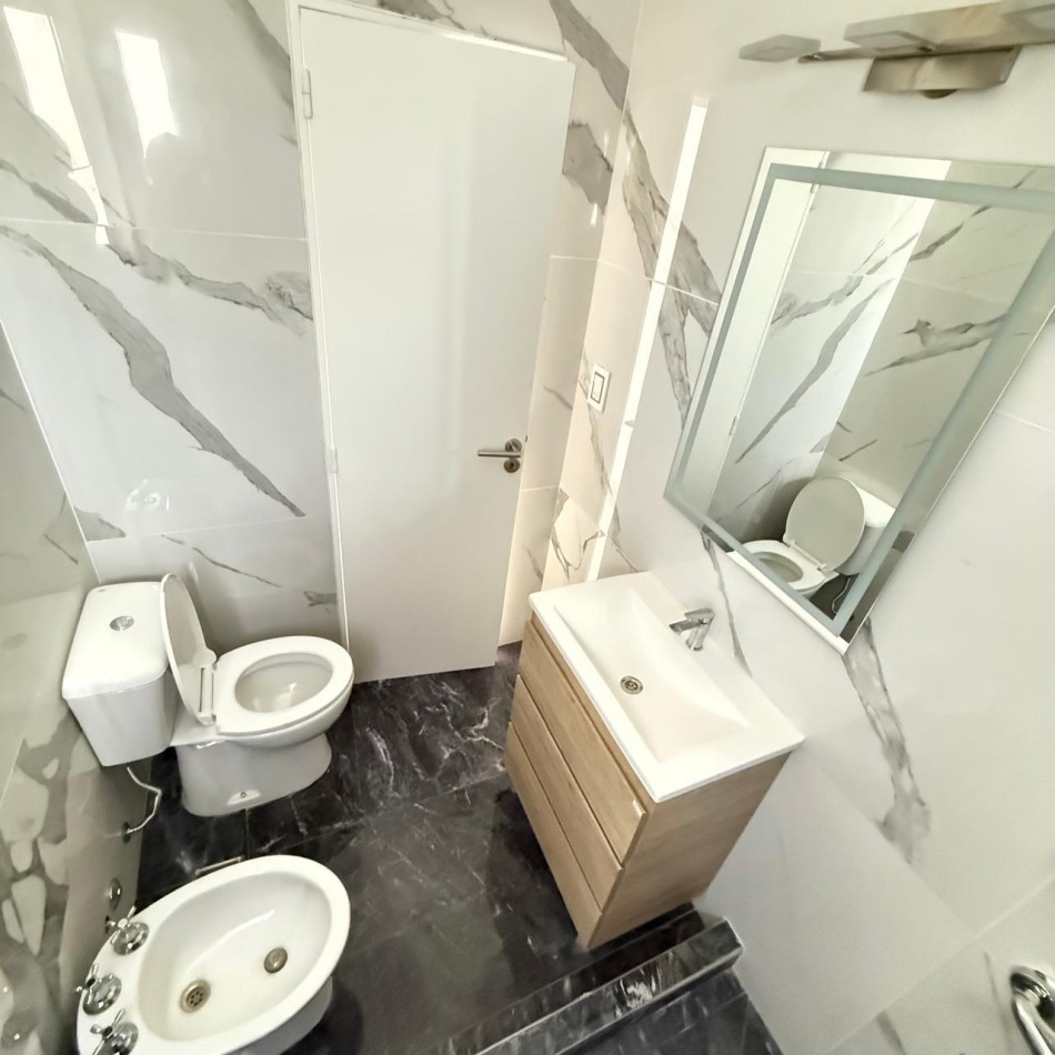 El dormitorio dispone de un placard hecho a medida, aportando comodidad y orden, y el baño completo se presenta con terminaciones contemporáneas.